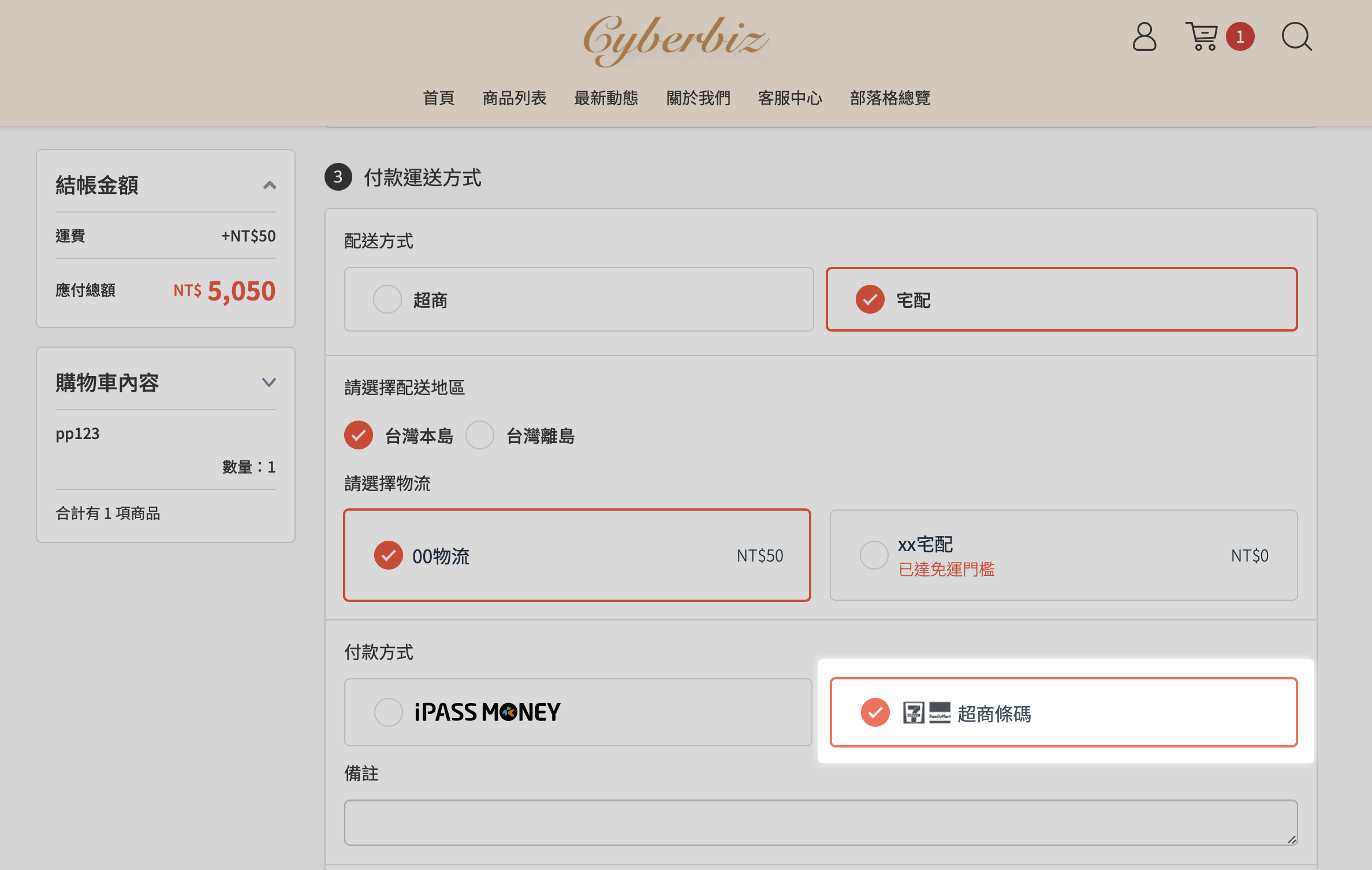 - 消費者可於結帳頁,選擇「超商條碼」繳費。