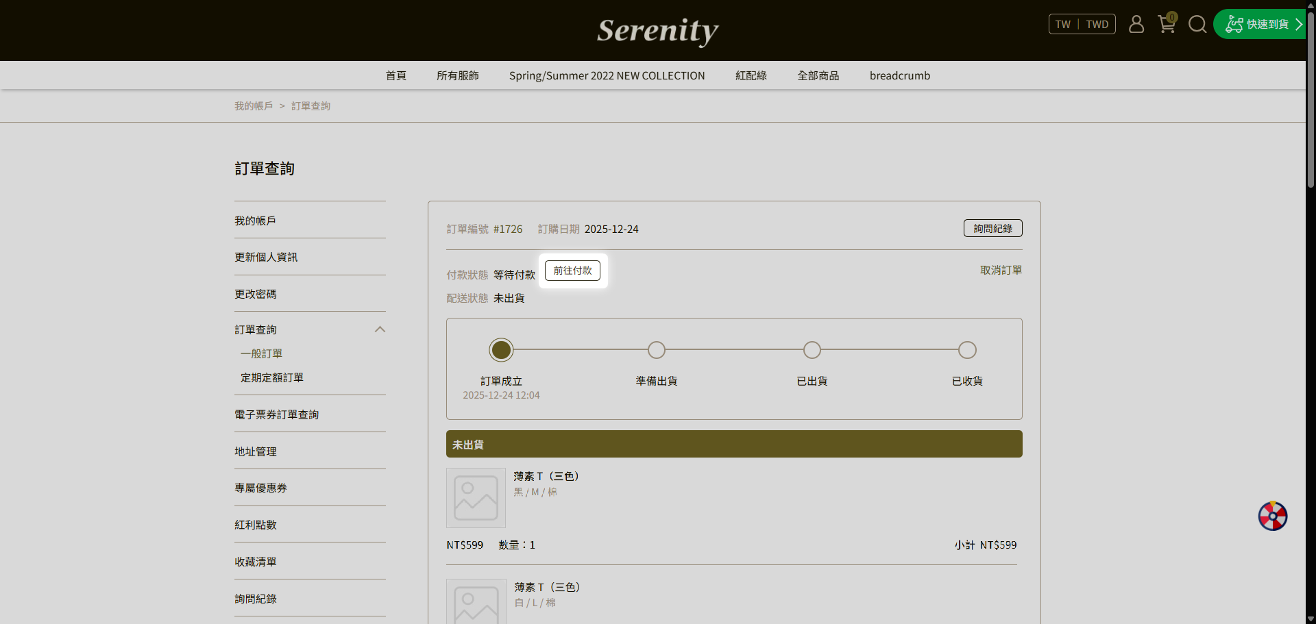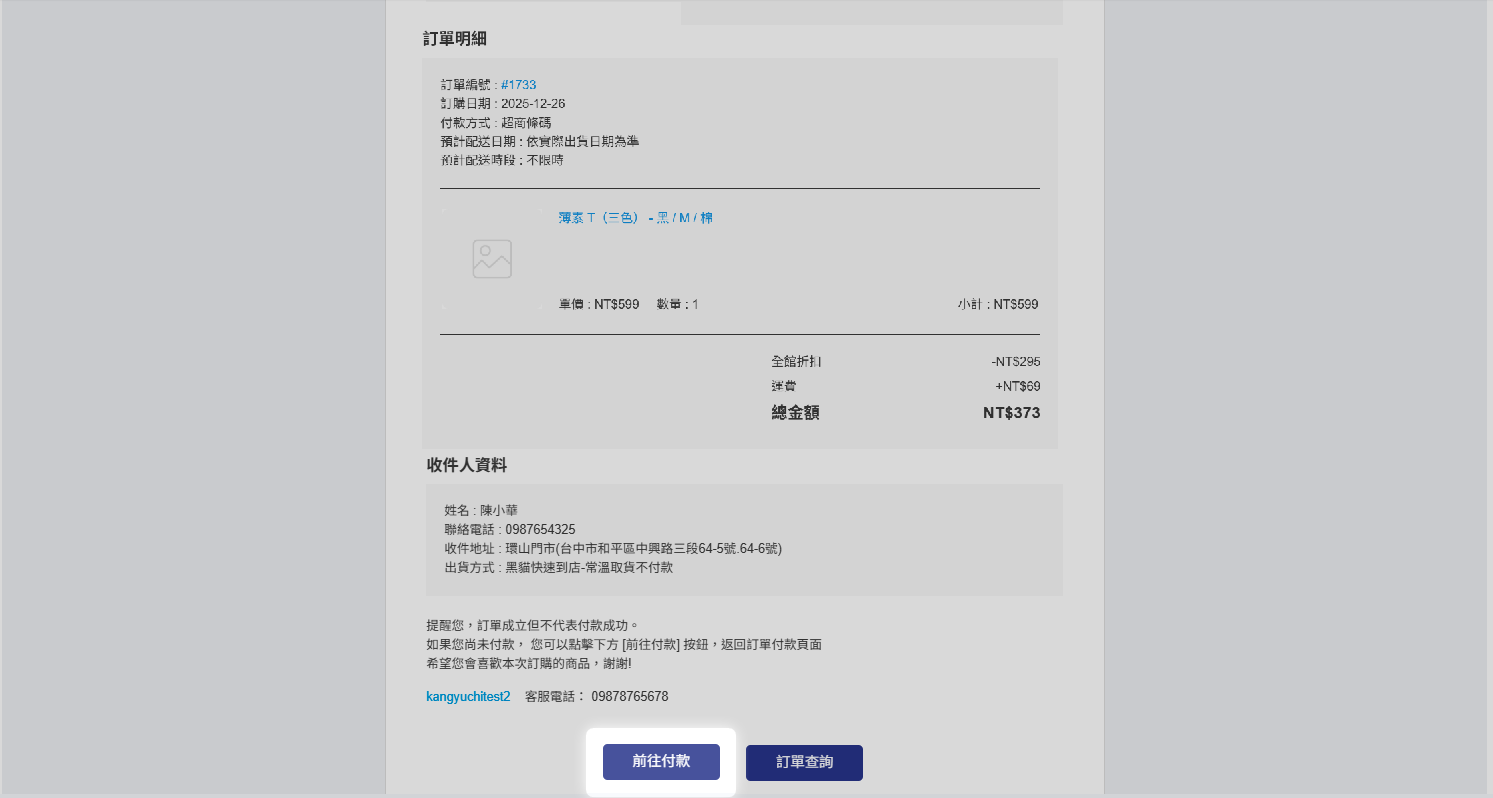 - 可同步於訂單查詢頁,點擊「前往付款」,進入訂單成立頁。
