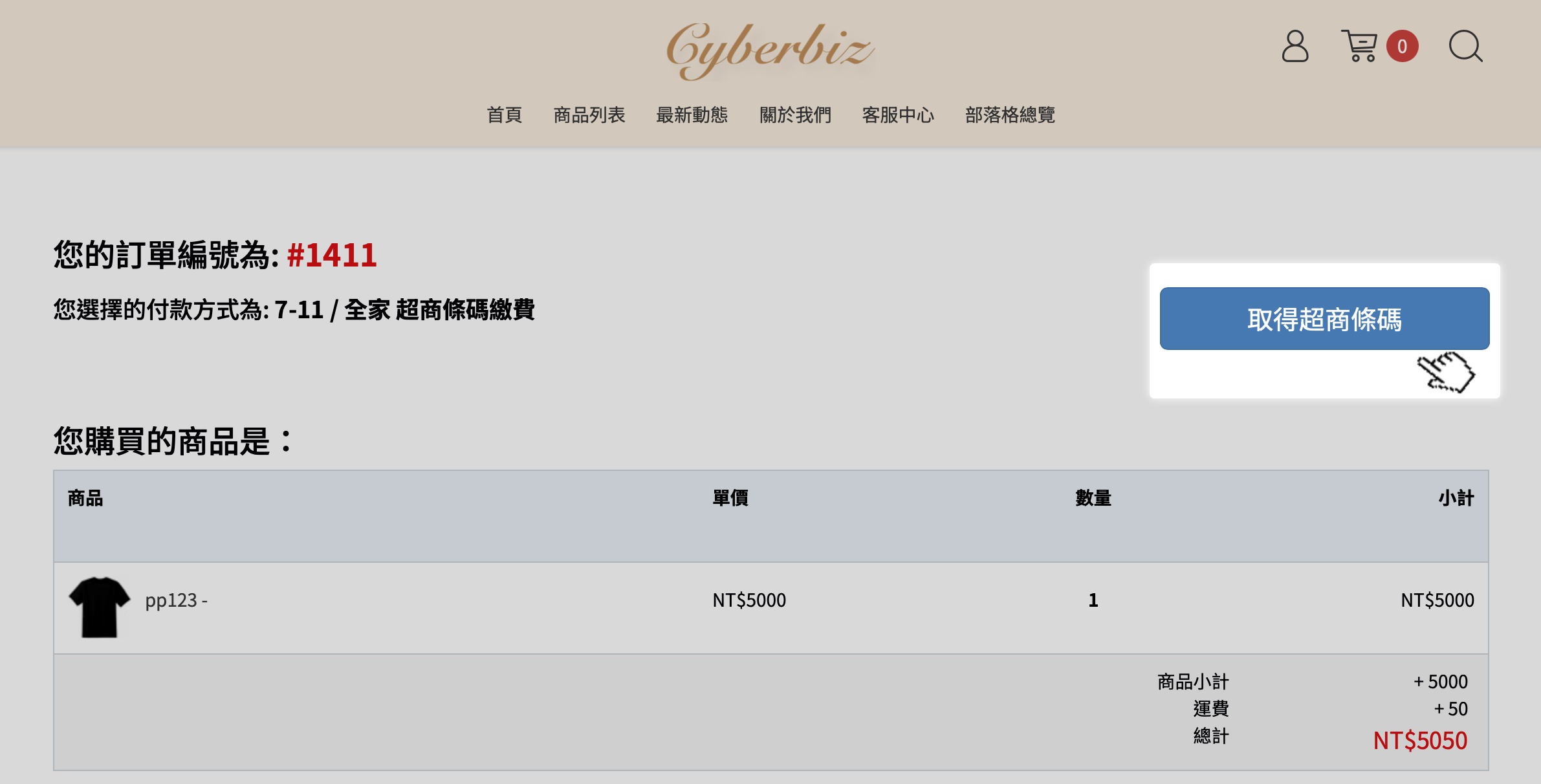 - 下單完成後,可於訂單成立頁取得超商條碼。