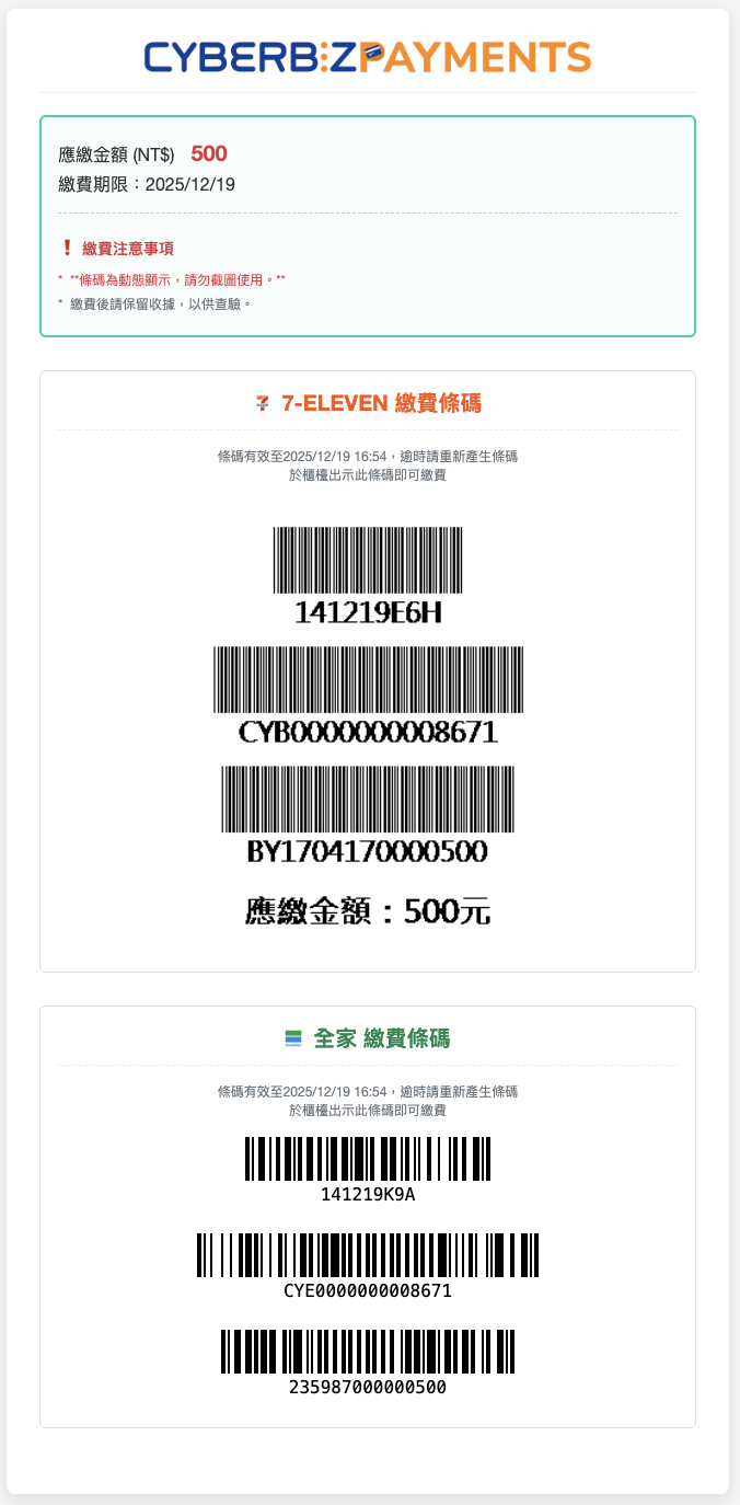 - 請將超商條碼畫面,提供給超商人員掃描結帳。